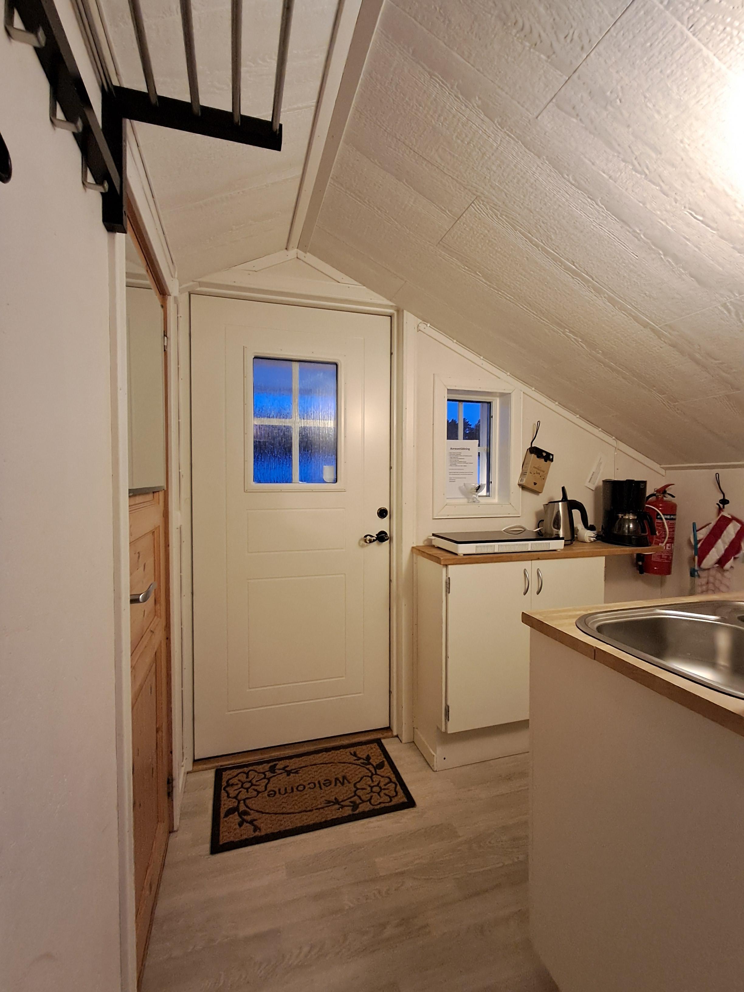Trappen på gaveln av den lilla stugan på gården leder dig upp till "loftet", vår tvåbäddslägenhet. Här har du egen toalett, dusch och en liten kokvrå. Här på Rutsbrogården råder generellt självhushållning, vilket innebär att ni tar med mat, dryck, sängkläder och handduk samt hygienartiklar själva men det finns möjlighet att göra vissa tillval så som bäddning, avresestädning och frukostpåse.