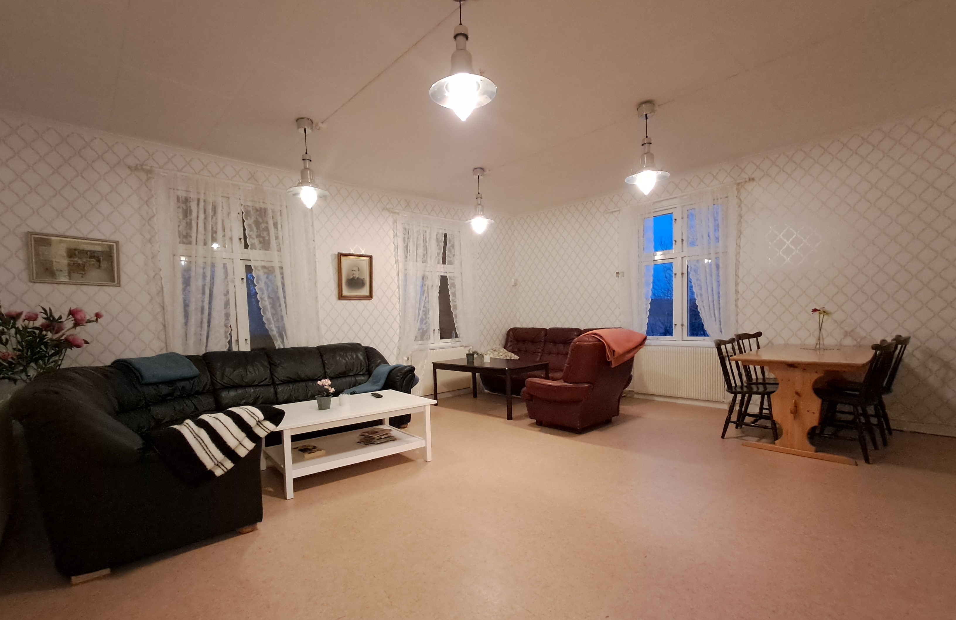 I vandrarhemmet, som är det stora huset på gården finns ett flerbäddsrum på nedre våningen och fem mindre rum på övervåningen. I köket finns utrustning för all typ av matlagning och på nedervåningen finns ett trevligt vardagsrum där du kan koppla av framför teven eller kanske bara umgås en stund.
