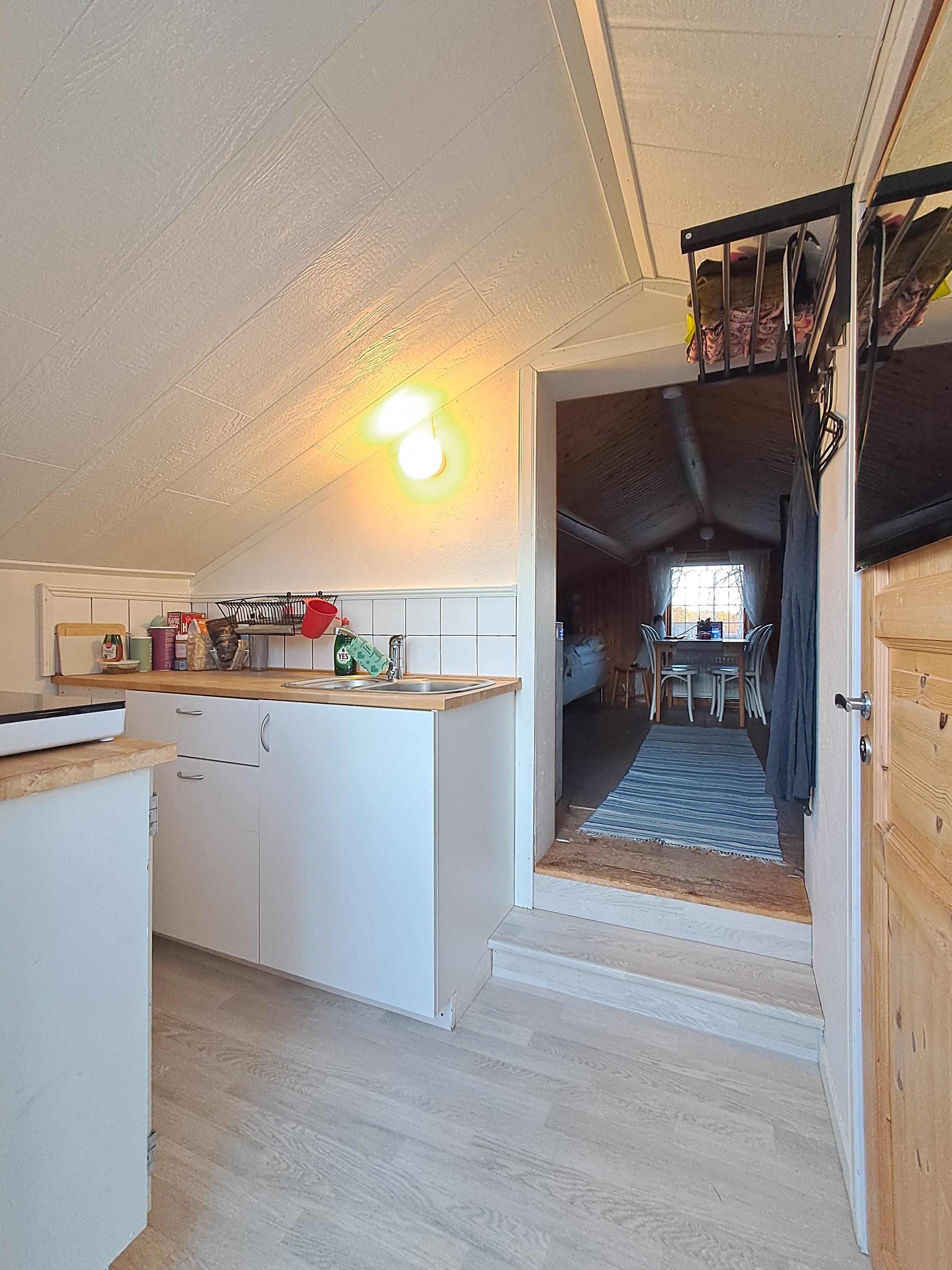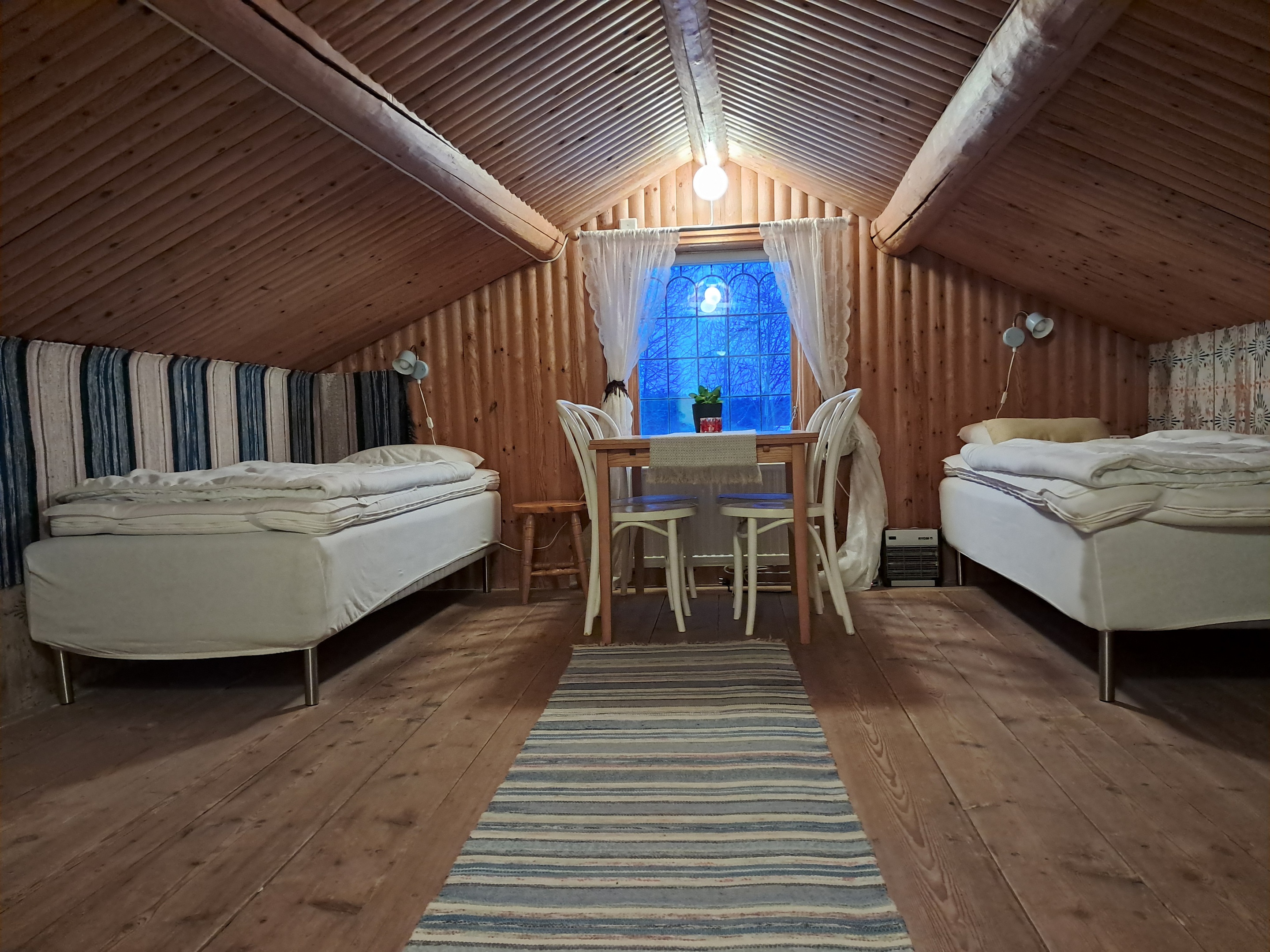 Trappen på gaveln av den lilla stugan på gården leder dig upp till "loftet", vår tvåbäddslägenhet. Här har du egen toalett, dusch och en liten kokvrå. Här på Rutsbrogården råder generellt självhushållning, vilket innebär att ni tar med mat, dryck, sängkläder och handduk samt hygienartiklar själva men det finns möjlighet att göra vissa tillval så som bäddning, avresestädning och frukostpåse.