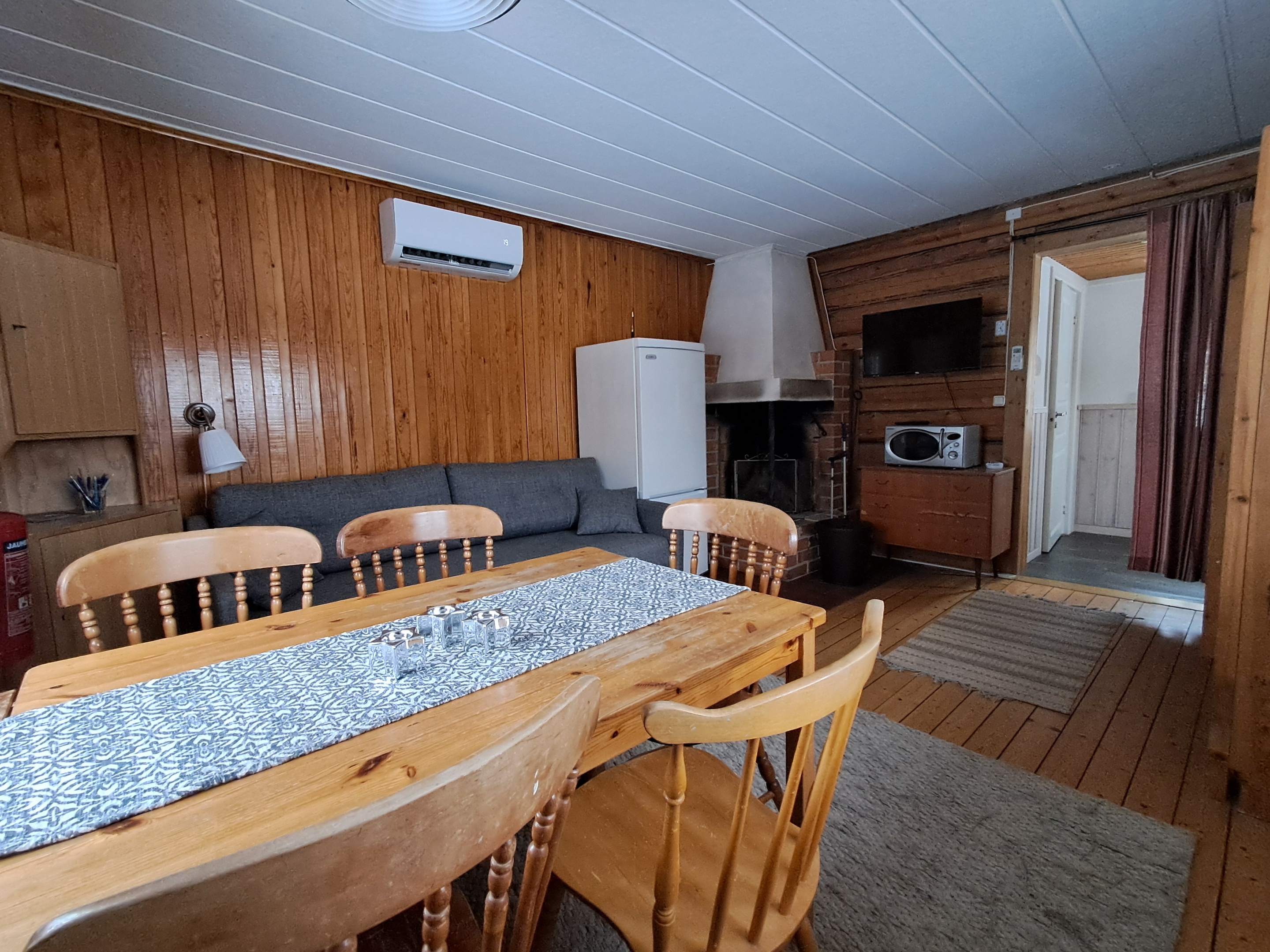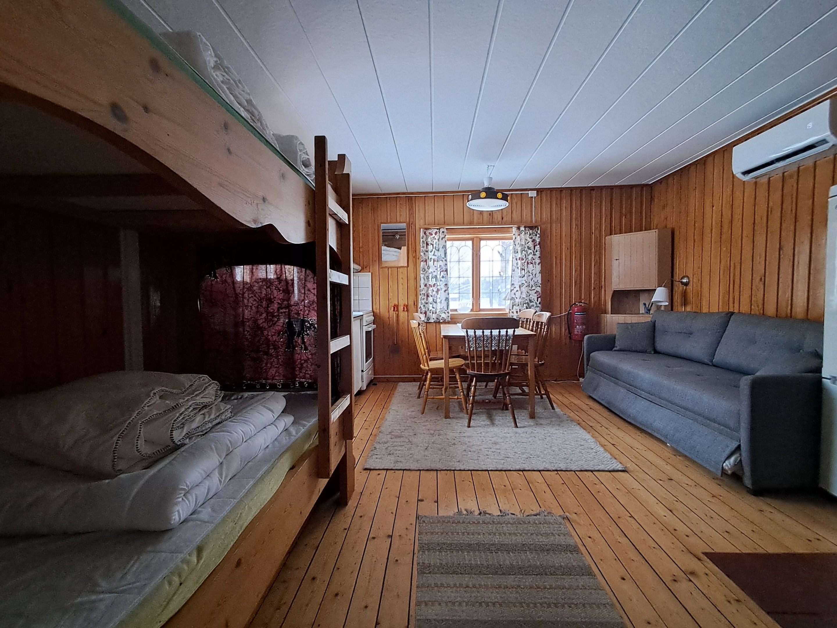I den lilla stugan på gården finns en fyrbäddslägenhet på undervåningen "stugan" och ett tvåbäddsrum på övervåningen "loftet". "Stugan" har en hög- och låg säng samt en bäddsoffa. Eget kök samt toalett, dusch och en öppen spis. Sängkläder och handduk medtages själv men finns även att hyra.